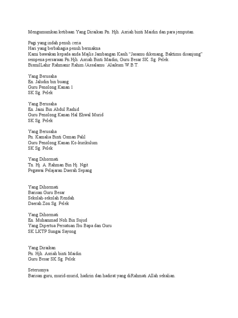 Setiap pertemuan sudah mestinya ada. Teks ucapan majlis perpisahan pn sarnah hj jamiran bismillahirrahmaniraahim, assalamualaikum w.b.t dan salam sejahtera. Sqamsuki bin sudin atas ucapan itu tadi. Majlis mengucapkan ribuan terima kasih kepada prof nasa atas ucapan sebentar tadi. Semoga segala amanat yang disampaikan sentiasa tersemat di jiwa, berlegar di minda.
